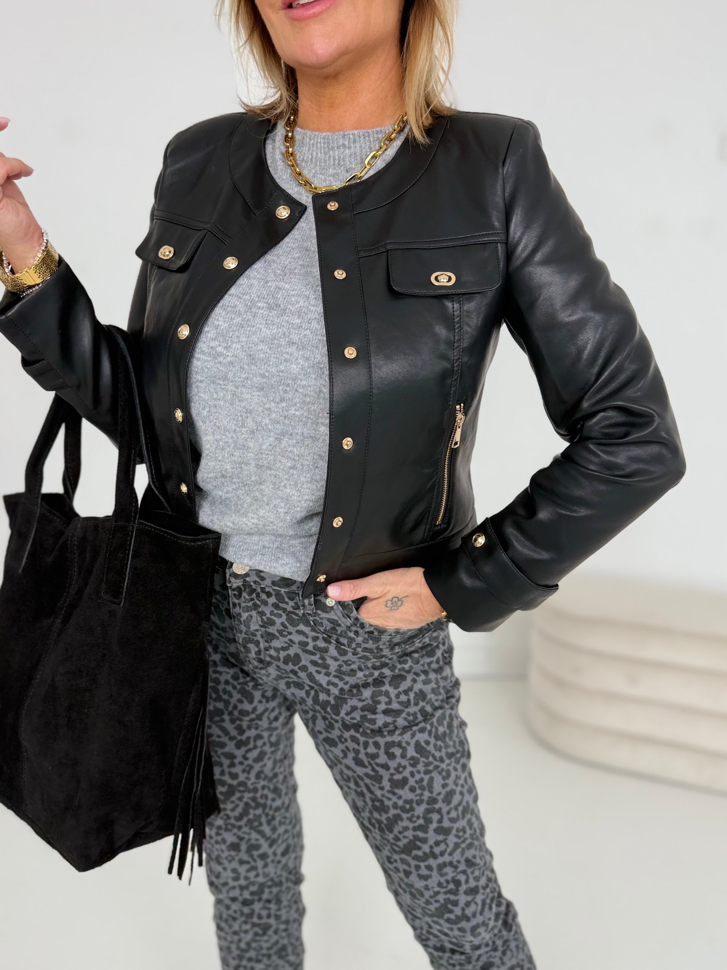 Wunderschöne Jacke, weiches Leder und schöne goldene Details, man kann es super kombinieren, auch im Winter als kurze Blazer, ich bin begeistert